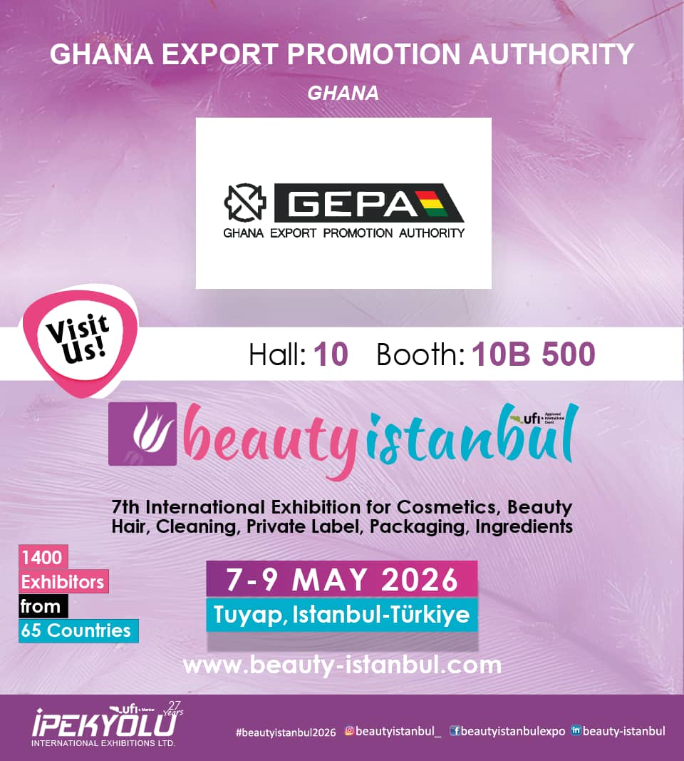 Gana İstanbul Başkonsolosluğu’nun tarafımıza ulaşan yazısına atfen; 7-9 Mayıs 2026 tarihlerinde İstanbul'da Tüyap Fuar Merkezinde düzenlenecek olan 7. Beauty Istanbul (Uluslararası Kozmetik, Güzellik, Saç, Ev Bakım, Private Label, Ambalaj ve Hammadde) Fuarı’na Gana’nın milli katılım sağlayacağı, fuar alanında 10. Salon, 10B 500 numaralı stantta yer alacağı bildirilmiştir.