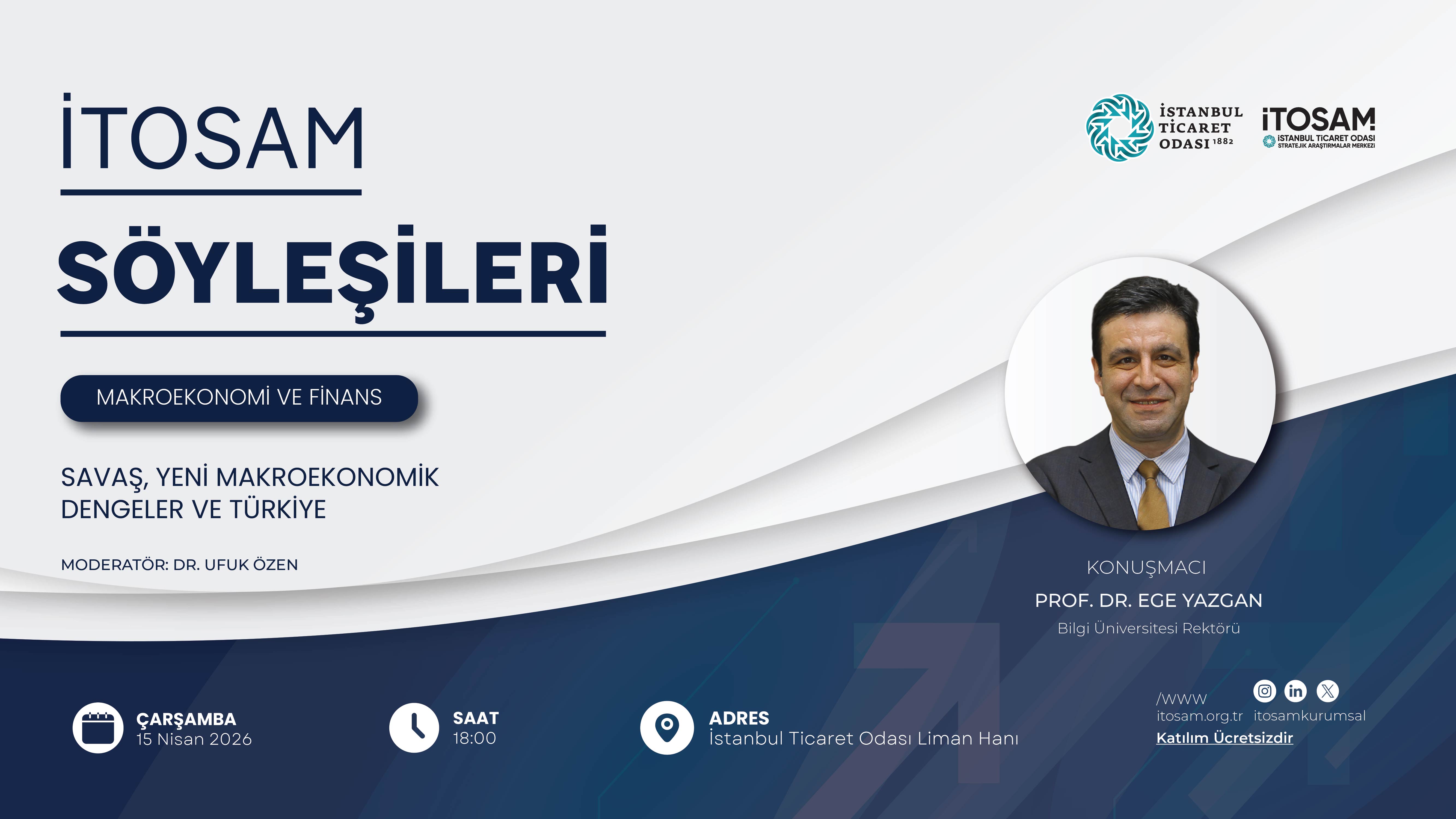 İstanbul Ticaret Odası Stratejik Araştırmalar Merkezi (İTOSAM) tarafından düzenlenen “İTOSAM Söyleşileri”, 15 Nisan 2026 tarihinde Odamız Liman Han Binası giriş kat Söyleşi Salonu’nda gerçekleştirilecektir. Söyleşiler, güncel ekonomik ve toplumsal konuların ele alınmasına zemin hazırlayarak iş dünyası, akademi ve kamuoyu arasında köprü kurulmasına katkı sağlamayı amaçlamaktadır.