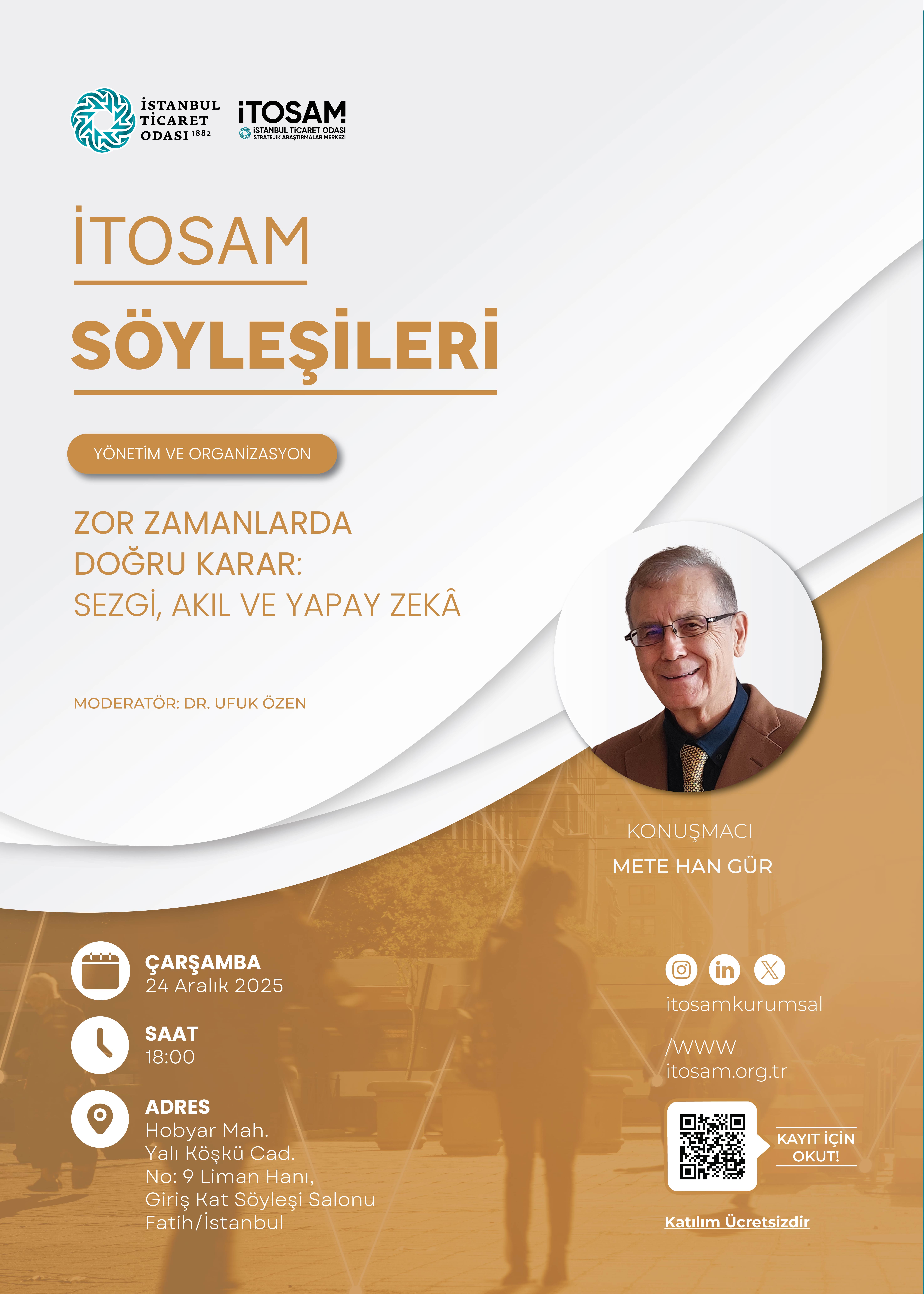Söyleşide Mete Han Gür ile “Zor Zamanlarda Doğru Karar: Sezgi, Akıl ve Yapay Zekâ” başlıklı konu ele alınacaktır.