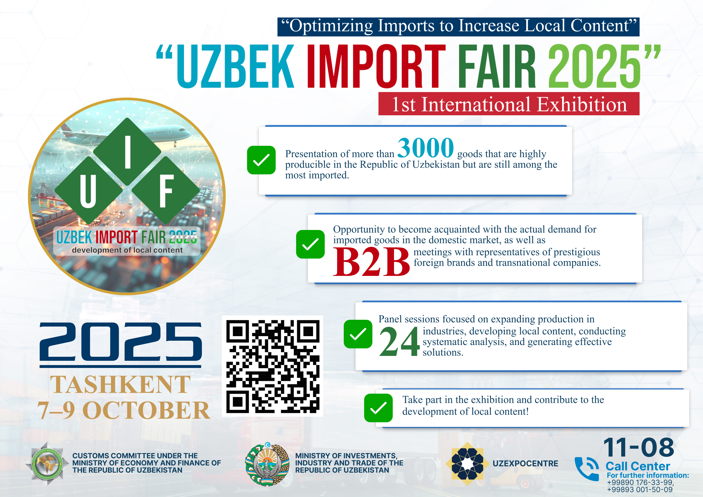 Özbekistan Cumhuriyeti Ankara Büyükelçiliği tarafından Odamıza iletilen e-postada; 7-9 Ekim 2025 tarihlerinde Taşkent'te “Özbekistan İthalat Fuarı 2025” adlı uluslararası fuarın düzenleneceği bildirilmiştir. Bu etkinlik kapsamında yuvarlak masa toplantıları, B2B toplantıları ve ağ oluşturma oturumları dahil olmak üzere çok çeşitli etkinlikler planlandığı bildirilmiştir.